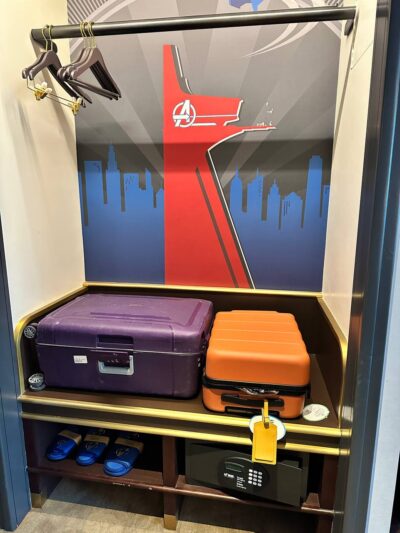 We stayed in a Marvel-themed room. We had two double beds, a tv, a nightstand, a desk and chair, a water dispenser, a closet area with a safe, and a bathroom that was not a split bathroom. Because we didn’t buy the amenity kits, the only amenities in the room were towels, shampoo and body wash, and slippers that were marvel themed.