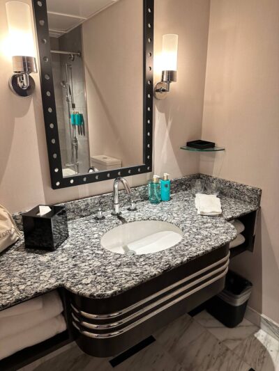 While I enjoyed the design of the room, there were still some drawbacks to it. There was no dresser under the tv, meaning there’s not really any storage to unpack your belongings. Additionally, the bathroom is really tight and tiny. The shower especially was so small compared to other Disney hotels I stayed at that it was a little claustrophobia inducing. The lack of a split bathroom can also be challenging for groups or families of 4. But overall, it’s a nice hotel room and I wish I spent more time in it.