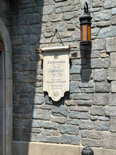 In comparing how this queue sets up the story of the ride compared to other HKDL queues, this queue falls in the middle of the pack. While being detailed and immersive, it doesn’t really set up the story of the ride itself, with the exception of there being one banner serving as a “royal proclamation” for Summer Snow Day. One could argue that the story of Frozen Ever After is so simple that it doesn’t need to have a lot of setup in the queue, but anything extra that could have been added to the queue to add another story layer, such as explanations for how Summer Snow Day became a holiday in Arendelle or an itinerary of what guests will see on the their tour of the kingdom, would have been neat to see.