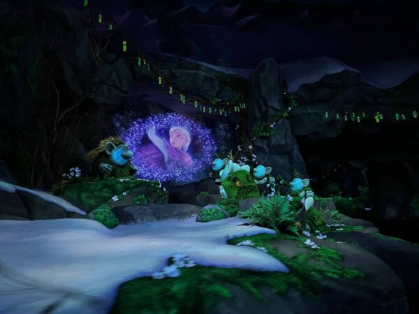 After seeing Olaf and Sven, you turn a corner and come face to face with the trolls from the movie. Grand Pabbie mentions that on this day, Anna saved Elsa with an unselfish act of true love, as depicted in the movie. A troll then translates this into Cantonese, the second and final Cantonese line in the attraction. You then reach the lift hill as you go up to Elsa’s Ice Palace. The Frozen theme music plays as your boat makes its way up the lift hill.