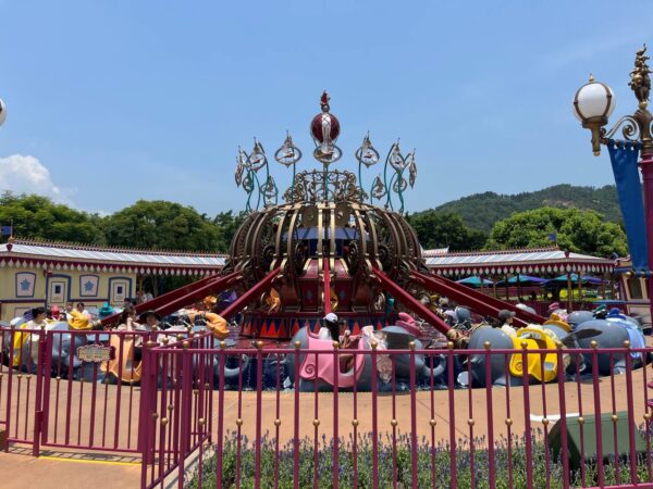 The staple tea cups ride that is found everywhere else, this version is the most bare bones version of the ride. The queue is uninspired, the building of the attraction is a generic tent with some lanterns on it, and its location in Fantasyland is very awkward and kind of feels like they plopped it there last minute for the sake of adding a ride to the park’s opening day ride count.